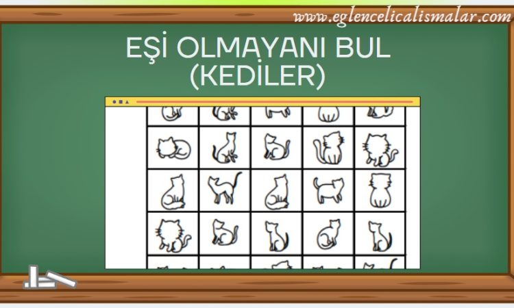 Eşi Olmayanı Bul (Kediler) eğlenceli bir dikkat geliştirme bulmacasıdır. ilkokulun her seviyesinde kullanılabilir. Her bir sayfa iki farklı bölümden oluşmaktadır. Bu tabloların her birinde eşi olmayan şeklin bulunup işaretlenmesi isteniyor. Cevap anahtarları her bir setin altına eklenmiştir. Set 30 sayfa ve 60 bölümden (bulmaca) oluşmaktadır. Faydalı olması dileğiyle.