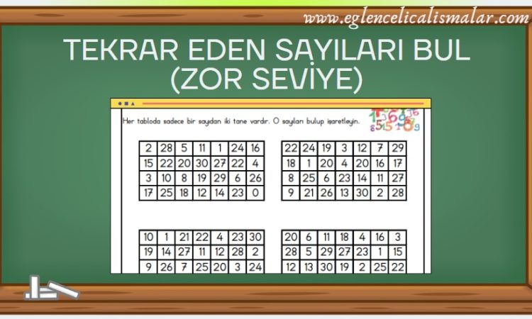 Etkinlikte her bir tabloda sadece bir sayıdan iki tane diğer sayılardan birer tane bulunmaktadır. Bu tekrar eden sayıların bulunması istenilmektedir.