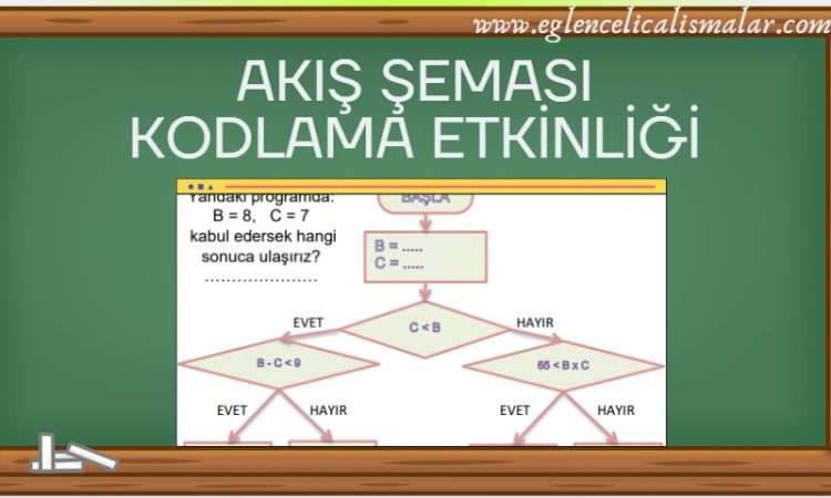 Akış Şeması Kodlama Etkinliği setinde her bir sayfada iki farklı dallanmış ağaç bulunmaktadır. Her birinde verilen bilgilerin doğru veya yanlış olma durumuna göre hangi çıkışa ve sonuca ulaşılacağının bulunması beklenmektedir. Her bir sayfanın cevap anahtarı ek olarak sunulmuştur. Bu etkinlik 3. ve 4. sınıf öğrencileri ile daha üst sınıf öğrencileri için uygundur. Hem temel matematik bilgilerinin tekrar edilmesi hem de akış şeması aracılığıyla kodlama mantığının kazandırılması amaçlanmıştır. Set 30 sayfa ve 60 farklı etkinlikten oluşmaktadır.