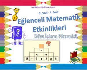 Dört İşlem Piramidi çalışması eğlenceli bir matematik çalışmasıdır. 3. sınıf ve 4. sınıf seviyesine uygundur. Piramitte sayılar arasındaki işarete dikkat ederek işlem yapılması ve sonucun