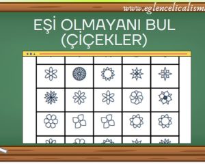 Eşi Olmayanı Bul (Çiçekler) eğlenceli bir dikkat geliştirme bulmacasıdır. ilkokulun her seviyesinde kullanılabilir. Her bir sayfa iki farklı bölümden oluşmaktadır. Bu tabloların her birinde eşi