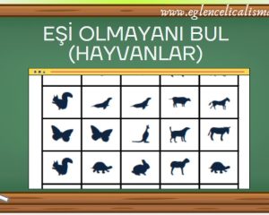 Eşi Olmayanı Bul (Hayvanlar) eğlenceli bir dikkat geliştirme bulmacasıdır. ilkokulun her seviyesinde kullanılabilir. Her bir sayfa iki farklı bölümden oluşmaktadır. Bu tabloların her birinde eşi