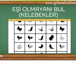 Eşi Olmayanı Bul (Kelebekler) eğlenceli bir dikkat geliştirme bulmacasıdır. ilkokulun her seviyesinde kullanılabilir. Her bir sayfa iki farklı bölümden oluşmaktadır. Bu tabloların her birinde eşi