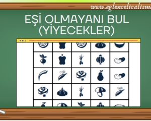 Eşi Olmayanı Bul (Yiyecekler) eğlenceli bir dikkat geliştirme bulmacasıdır. ilkokulun her seviyesinde kullanılabilir. Her bir sayfa iki farklı bölümden oluşmaktadır. Bu tabloların her birinde eşi