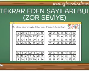 Tekrar Eden Sayıları Bul (Zor Seviye) etkinlik setinde her bir sayfada iki farklı bölüm ve toplam 8 bulmaca (tablo) bulunmaktadır. Her sayfanın altında cevap anahtarı