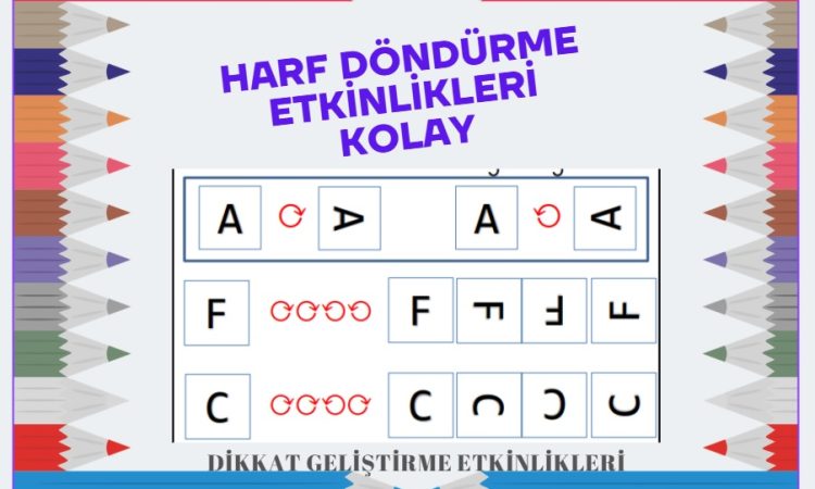 Harf döndürme etkinliğinde, yönergeye uygun olarak adım adım sağa veya sola (çeyrek tur) dönüşlerle harfin son durumda bulunacağı durumun belirlenmesi istenilmektedir. Bir sayfada 2 farklı bölüm ve toplamda 4 farklı soru bulunmaktadır. Her sayfanın altına cevap anahtarı eklenmiştir. Bu set dikkat gelişimini, görsel uzamsal zekanın gelişimini destekleme amacıyla hazırlanmıştır. Set 30 sayfadan oluşmaktadır.