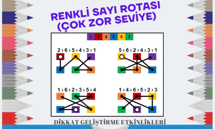 Renkli Sayı Rotası Çok Zor Seviye etkinlik seti, Görsel Dikkat, Şifreleme ve İnce Motor becerilerini geliştirmek için tasarlanmış eğlenceli bir etkinliktir. Etkinlikte sayıların renklere dönüştürülmesi ve noktaların doğru sırayla birleştirilerek hedefe ulaşılması beklenilmektedir. Çok Zor seviye rotası 6 sayıdan oluşmaktadır. Sırasıyla sayıların gösterdiği kutuların birleştirilmesi gerekmektedir. Her bir bölümde ilk etkinlik cevaplı olarak paylaşılmıştır. Ayrıca her sayfanın altında cevap anahtarı bulunmaktadır. Set 100 sayfa ve her bir sayfada iki farklı bölüm olmak üzere 200 etkinlikten oluşmaktadır. Dikkat gelişimi desteklenmesi için kullanılabilir. Çok Zor seviye olması sebebiyle ilkokul ve ortaokul sınıf seviyeleri için zor seviyeden sonra uygundur.