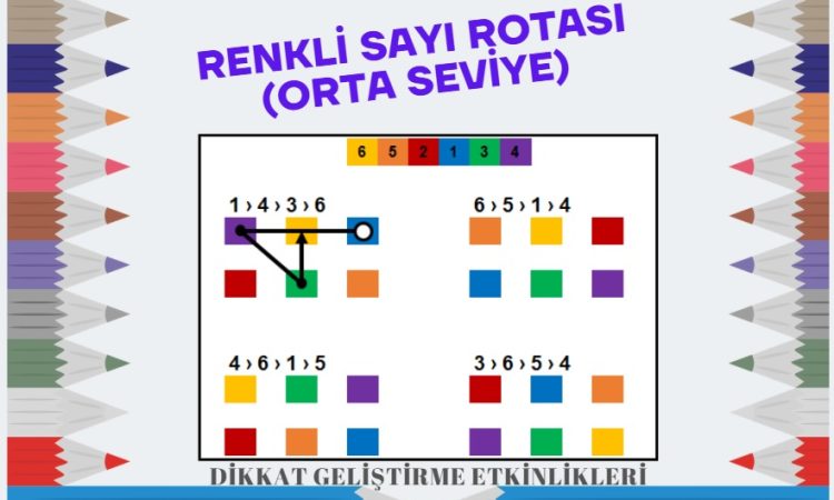 Renkli Sayı Rotası Orta Seviye etkinlik seti, Görsel Dikkat, Şifreleme ve İnce Motor becerilerini geliştirmek için tasarlanmış eğlenceli bir etkinliktir. Etkinlikte sayıların renklere dönüştürülmesi ve noktaların doğru sırayla birleştirilerek hedefe ulaşılması beklenilmektedir. Orta seviye rotası 4 sayıdan oluşmaktadır. Sırasıyla sayıların gösterdiği kutuların birleştirilmesi gerekmektedir. Her bir bölümde ilk etkinlik cevaplı olarak paylaşılmıştır. Ayrıca her sayfanın altında cevap anahtarı bulunmaktadır. Set 100 sayfa ve her bir sayfada iki farklı bölüm olmak üzere 200 etkinlikten oluşmaktadır. Dikkat gelişimi desteklenmesi için kullanılabilir. Orta seviye olması sebebiyle okul öncesi ve ilkokul sınıf seviyeleri için kolay seviyeden sonra uygundur.