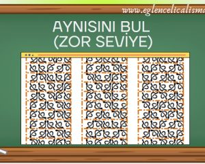 Dikkat Etkinlikleri Aynısını Bul çalışmaları eğlenceli bir dikkat geliştirme etkinliğidir. Aynısını bul çalışmalarında bir sayfada iki farklı etkinlik bulunmaktadır. Etkinlikte amaç, yönergede verilen beş şeklin