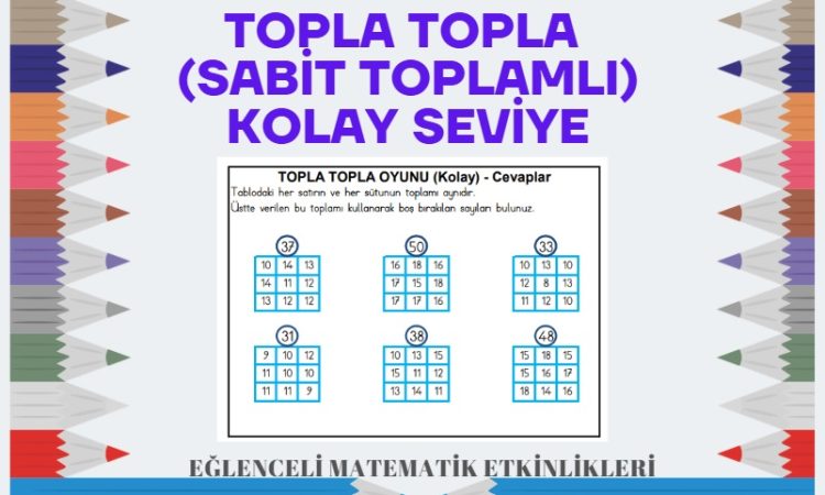 Topla Topla (Sabit Toplamalı) Kolay seviyedeki etkinlik setindeki 3×3 tablolardaki sayıların satır ve sütunlardaki toplamları eşittir ve tabloların üzerinde gösterilmiştir. Tablolar bu bilgileri kullanarak zincirleme şekilde tüm tablonun çözüleceği şekilde oluşturulmuştur. Set her birinde 2 farklı bölüm ve 12 tablodan oluşan 50 sayfadan (600 tablo) oluşmaktadır. Her bir sayfanın altında cevap anahtarı paylaşılmıştır. Etkinlik 2. sınıf ve üzerindeki sınıf seviyeleri için uygundur.
